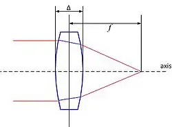 where f is the focal length, and Δ is the thickness of the lens.