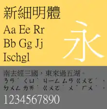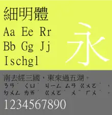 | PMingLiU | 新細明體 | TC (Taiwan) | Microsoft Windows 95+ | Distributed with Traditional Chinese version of Windows 95, all regional versions of Windows 2000 to Windows 8.1, and the Traditional Chinese version of Windows 10. The Latin characters in this font is proportional. | ||