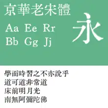 | KingHwa OldSong | 京華老宋体 | 特里王 | Covers CJK Unified Ideographs, CJK Unified Ideographs Extension A; partially covers CJK Unified Ideographs Extension B, and covers all encoded simplified Chinese characters. Also covers all commonly used characters in UBPSHNVN's Nôm standard. |