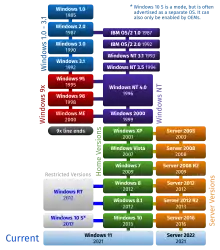The first five versions of Windows–Windows 1.0, Windows 2.0, Windows 2.1, Windows 3.0, and Windows 3.1–were all based on MS-DOS, and were aimed at both consumers and businesses. However, Windows 3.1 had two separate successors, splitting the Windows line in two: the consumer-focused "Windows 9x" line, consisting of Windows 95, Windows 98, and Windows Me; and the professional Windows NT line, comprising Windows NT 3.1, Windows NT 3.5, Windows NT 3.51, Windows NT 4.0, and Windows 2000. These two lines were reunited into a single line with the NT-based Windows XP; this Windows release succeeded both Windows Me and Windows 2000 and had separate editions for consumer and professional use. Since Windows XP, multiple further versions of Windows have been released, the most recent of which is Windows 11.