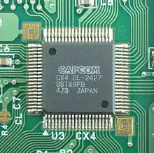 The Cx4 chip is a math coprocessor used by Capcom and produced by Hitachi (now Renesas) to perform general trigonometric calculations for wireframe effects, sprite positioning, and rotation. It maps and transforms wireframes in Capcom's second and third games of the Mega Man X series.[2] It is based on the Hitachi HG51B169 DSP and clocked at 20 MHz.[4] The name Cx4 stands for Capcom Consumer Custom Chip.[5]