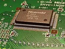 This series of fixed-point digital signal processor chips provides fast vector-based calculations, bitmap conversions, 2D and 3D coordinate transformations, and other functions.[7] The chip has four revisions, each physically identical but with different microcode. The DSP-1 version, including the later 1A die shrink and 1B bug fix revisions, was most often used; the DSP-2, DSP-3, and DSP-4 were used in only one game each.[8] All of them are based on the NEC μPD77C25 CPU and clocked at 8 MHz.[4]