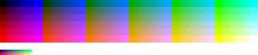Red #000000 #330000 #660000 #990000 #CC0000 #FF0000 Green #000000 #002400 #004900 #006D00 #009200 #00B600 #00DB00 #00FF00 Blue #000000 #000040 #000080 #0000BF #0000FF