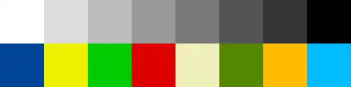 0 — white 8 — dark blue 1 — grey #1 9 — yellow 2 — grey #2 10 — green 3 — grey #3 11 — red 4 — grey #4 12 — beige 5 — grey #5 13 — dark green 6 — grey #6 14 — gold/orange 7 — black 15 — light blue