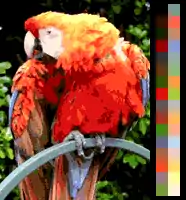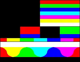For each unique palette, an image color test chart and sample image (original True color version follows) rendered with that palette (without dithering unless otherwise noted) are given. The test chart shows the full 8-bit, 256 levels of the red, green and blue (RGB) primary colors and cyan, magenta and yellow complementary colors, along with a full 8-bit, 256 levels grayscale. Gradients of full saturation of intermediate colors (orange, yellow-green, green-cyan, blue-cyan, violet, and red-magenta), and a full hue spectrum are also present. Color charts are not gamma corrected.