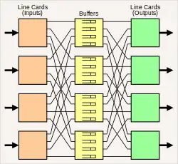 As shown in the figure to the right, a load-balanced switch has N input line cards, each of rate R, each connected to N buffers by a link of rate R/N. Those buffers are in turn each connected to N output line cards, each of rate R, by links of rate R/N. The buffers in the center are partitioned into N virtual output queues.