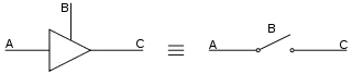 Electronic logic gates differ significantly from their relay-and-switch equivalents. They are much faster, consume much less power, and are much smaller (all by a factor of a million or more in most cases). Also, there is a fundamental structural difference. The switch circuit creates a continuous metallic path for current to flow (in either direction) between its input and its output. The semiconductor logic gate, on the other hand, acts as a high-gain voltage amplifier, which sinks a tiny current at its input and produces a low-impedance voltage at its output. It is not possible for current to flow between the output and the input of a semiconductor logic gate.