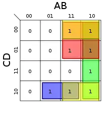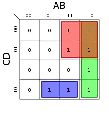The boxes represent the minimal AND/OR terms needed to implement this function: