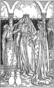 The "wretched sister" of the jötnar appears, asks for a bridal gift from "Freyja", and the jötnar bring out Mjöllnir to "sanctify the bride", to lay it on her lap, and marry the two by "the hand" of the goddess Vár. Thor laughs internally when he sees the hammer, takes hold of it, strikes Þrymr, beats all of the jötnar, and kills the "older sister" of the jötnar.[30]