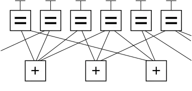 Below is a graph fragment of an example LDPC code using Forney's factor graph notation. In this graph, n variable nodes in the top of the graph are connected to (n−k) constraint nodes in the bottom of the graph.
