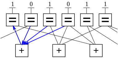 For example, consider that the valid codeword, 101011, from the example above, is transmitted across a binary erasure channel and received with the first and fourth bit erased to yield ?01?11. Since the transmitted message must have satisfied the code constraints, the message can be represented by writing the received message on the top of the factor graph.