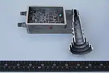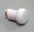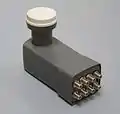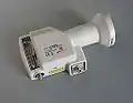 In February 2016, Sky (UK) launched a new LNB only compatible with their new wideband tuner.[15] This LNB has one port for all vertical polarised channels both low and high band, and another port for all low and high band horizontal channels. The basic model has only 2 connections and presumably has a local oscillator of 10.41 GHz with an intermediate frequency of 290–2340 MHz from an input of 10.7–12.75 GHz. This LNB seems to be the same as Unitron's ASTRA Universal Wideband LNB.[16] Two cables minimum are needed to access all channels. In the Sky Q box, multiple tuners can select multiple channels, more than the usual two for dual coax systems. This type of LNB is incompatible with the more common Astra Universal LNB used in the UK meaning the LNB is changed during upgrade. There is a model of the LNB with 6 connections, 2 for Sky Q and 4 Astra Universal LNB for users with multiple legacy systems such as Freesat in addition to Sky Q. In cases where only a single cable is possible, such as apartment blocks, Sky Q compatible multiswitches can be used, which instead use BSkyB SCR.[17]