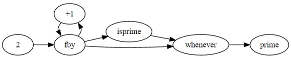 using the operator 'fby' (a mnemonic for "followed by"). fby defines what comes after the previous