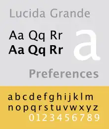 Lucida Grande is a humanist sans-serif typeface. It is a member of the Lucida family of typefaces designed by Charles Bigelow and Kris Holmes. It is best known for its implementation throughout the macOS user interface from 1999 to 2014, as well as in other Apple software like Safari for Windows. As of OS X Yosemite (version 10.10), the system font was changed from Lucida Grande to Helvetica Neue.[1] In OS X El Capitan (version 10.11) the system font changed again, this time to San Francisco.[2]