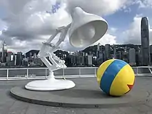 Luxo Jr. is a semi-anthropomorphic toy desk lamp character used as the primary mascot of Pixar Animation Studios. He is the protagonist of the short film Luxo Jr. and appears on the production logo of every Pixar film, hopping into view and jumping on the capital letter "I" in "PIXAR" to flatten it. John Lasseter created the character, modeling it after his own Luxo brand lamp.[1] In 2009, the manufacturer of Luxo lamps sued Disney, the parent company of Pixar, for selling Luxo Jr.-branded merchandise.[2]