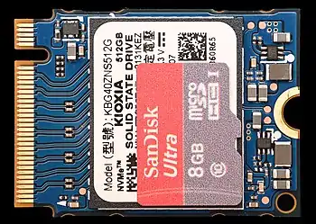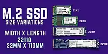 ![]() An M.2 2280 solid-state drive (SSD), 22 mm wide and 80 mm long | |