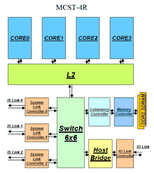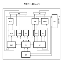 ![]() MCST R1000 core | ![]() MCST R1000 pipeline | ![]() MCST R1000 diagram | ![]() ccNUMA multiprocessor system with four MCST R1000 microprocessors |
