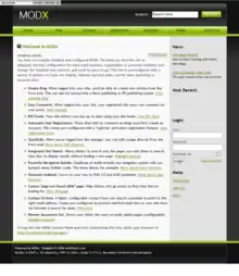 MODX (originally MODx) is an open source content management system and web application framework for publishing content on the World Wide Web and intranets. MODX is licensed under the GPL, is written in the PHP programming language, and supports MySQL, MariaDB and Percona Server as the database.[2] It was awarded Packt Publishing's Most Promising Open Source Content Management System in 2007.[3]