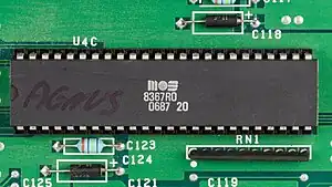 The MOS Technology "Agnus", usually called Agnus, is an integrated circuit in the custom chipset of the Amiga computer. The Agnus, Denise and Paula chips collectively formed the OCS and ECS chipsets.