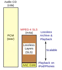 MPEG-4 SLS, or MPEG-4 Scalable to Lossless as per ISO/IEC 14496-3:2005/Amd 3:2006 (Scalable Lossless Coding),[1] is an extension to the MPEG-4 Part 3 (MPEG-4 Audio) standard to allow lossless audio compression scalable to lossy MPEG-4 General Audio coding methods (e.g., variations of AAC). It was developed jointly by the Institute for Infocomm Research (I2R) and Fraunhofer, which commercializes its implementation of a limited subset of the standard under the name of HD-AAC. Standardization of the HD-AAC profile for MPEG-4 Audio is under development (as of September 2009).[2][3]