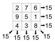 | (14 + 51 + 62 + 3) + (7 + 58 + 55 + 10) | =260 | (40 + 57 + 41 + 56) + (50 + 47 + 34 + 63) + (29 + 4 + 13 + 20) + (22 + 11 + 6 + 27) | =2 × 260 = 520 | ||||||||||||