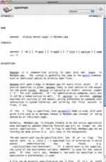 Man pages are included in the program; it has a Recents menu, where users can view recently-opened man pages, a Section selector to jump to a section of the manual, and a Find function that can search for text in the manual.[1] Included with the application is a command line utility called openman that will open invoked man pages in ManOpen.[2] Internally ManOpen does not directly view the man page but runs it though Harald Schlangmann's cat2html or cat2rtf into HTML or RTF for viewing.[3]