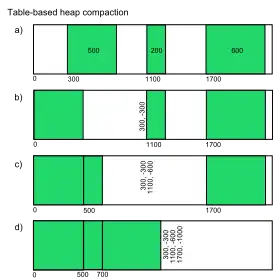 The Compressor compaction algorithm[2] has the lowest complexity among compaction algorithms known today. It extends IBM’s garbage collection for Java.[3] The serial version of the Compressor maintains a relocation map that maps the old address of each object to its new address (i.e., its address before compaction is mapped to its address after compaction). In a first pass, the mapping is computed for all objects in the heap. In a second pass, each object is moved to its new location (compacted to the beginning of the heap), and all pointers within it are modified according to the relocation map.