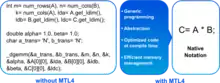 The MTL uses template programming, which considerably reduces the code length. All matrices and vectors are available in all classical numerical formats: float, double, complex<float> or complex<double>.