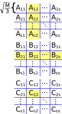The optimal variant of the iterative algorithm for A and B in row-major layout is a tiled version, where the matrix is implicitly divided into square tiles of size √M by √M:[7][8]
