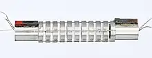 There are a great many combinations of resonators and transducers that can be used to construct a mechanical filter. A selection of some of these is shown in the diagrams. Figure 6 shows a filter using disc flexural resonators and magnetostrictive transducers. The transducer drives the centre of the first resonator, causing it to vibrate. The edges of the disc move in antiphase to the centre when the driving signal is at, or close to, resonance, and the signal is transmitted through the connecting rods to the next resonator. When the driving signal is not close to resonance, there is little movement at the edges, and the filter rejects (does not pass) the signal.[44] Figure 7 shows a similar idea involving longitudinal resonators connected together in a chain by connecting rods. In this diagram, the filter is driven by piezoelectric transducers. It could equally well have used magnetostrictive transducers.[33] Figure 8 shows a filter using torsional resonators. In this diagram, the input has a torsional piezoelectric transducer and the output has a magnetostrictive transducer. This would be quite unusual in a real design, as both input and output usually have the same type of transducer. The magnetostrictive transducer is only shown here to demonstrate how longitudinal vibrations may be converted to torsional vibrations and vice versa.[33][42][45] Figure 9 shows a filter using drumhead mode resonators. The edges of the discs are fixed to the casing of the filter (not shown in the diagram) so the vibration of the disc is in the same modes as the membrane of a drum. Collins calls this type of filter a disc wire filter.[42]
