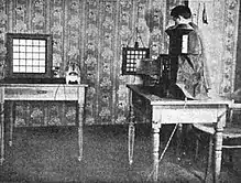 The first demonstration of the instantaneous transmission of images was made by a German physicist, Ernst Ruhmer, who arranged 25 selenium cells as the picture elements for a television receiver. In late 1909 he successfully demonstrated in Belgium the transmission of simple images over a telephone wire from the Palace of Justice at Brussels to the city of Liege, a distance of 115 km (71 mi). This demonstration was described at the time as "the world's first working model of television apparatus".[8] The limited number of elements meant his device was only capable of representing simple geometric shapes, and the cost was very high; at a price of £15 (US$45) per selenium cell, he estimated that a 4,000 cell system would cost £60,000 (US$180,000), and a 10,000 cell mechanism capable of reproducing "a scene or event requiring the background of a landscape" would cost £150,000 (US$450,000). Ruhmer expressed the hope that the 1910 Brussels Exposition Universelle et Internationale would sponsor the construction of an advanced device with significantly more cells, as a showcase for the exposition. However, the estimated expense of £250,000 (US$750,000) proved to be too high.[9]
