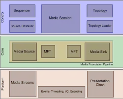 The MF architecture is divided into the Control layer, Core Layer and the Platform layer. The core layer encapsulates most of the functionality of Media Foundation. It consists of the media foundation pipeline, which has three components: Media Source, Media Sink and Media Foundation Transforms (MFT). A media source is an object that acts as the source of multimedia data, either compressed or uncompressed. It can encapsulate various data sources, like a file, or a network server or even a camcorder, with source specific functionality abstracted by a common interface. A source object can use a source resolver object which creates a media source from an URI, file or bytestream. Support for non-standard protocols can be added by creating a source resolver for them. A source object can also use a sequencer object to use a sequence of sources (a playlist) or to coalesce multiple sources into single logical source. A media sink is the recipient of processed multimedia data. A media sink can either be a renderer sink, which renders the content on an output device, or an archive sink, which saves the content onto a persistent storage system such as a file. A renderer sink takes uncompressed data as input whereas an archive sink can take either compressed or uncompressed data, depending on the output type. The data from media sources to sinks are acted upon by MFTs; MFTs are certain functions which transform the data into another form. MFTs can include multiplexers and demultiplexers, codecs or DSP effects like reverb. The core layer uses services like file access and networking and clock synchronization to time the multimedia rendering. These are part of the Platform layer, which provides services necessary for accessing the source and sink byte streams, presentation clocks and an object model that lets the core layer components function asynchronously, and is generally implemented as OS services. Pausing, stopping, fast forward, reverse or time-compression can be achieved by controlling the presentation clock.