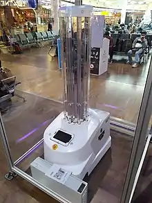 - Disinfection robot: It has the capability to disinfect a whole room in mere minutes, generally using pulsed ultraviolet light.[5][6] They are being used to fight Ebola virus disease.[7]