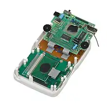 The Mega Duck features a multi board design, separating the motherboard, LCD, and controller PCB into three different assemblies. The battery compartment is found on the back casing, being the contacts connected by wires and soldered onto the main board.