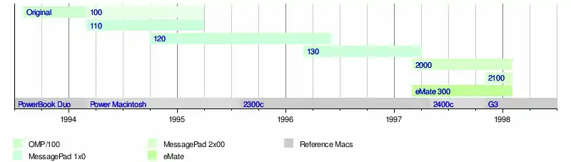 | Newton OS version | 1.0 to 1.05, or 1.10 to 1.11 | 1.11 | 1.2 or 1.3 | 1.3 | 1.3 or 2.0 | 1.3 | 2.0 | 2.1 (2.2) | 2.1 | 2.1 | |||||||||||