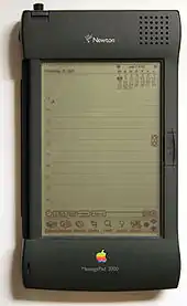 The MessagePad was a series of personal digital assistant devices developed by Apple Computer for the Newton platform in 1993. Some electronic engineering and the manufacture of Apple's MessagePad devices was undertaken in Japan by Sharp. The devices are based on the ARM 610 RISC processor and all featured handwriting recognition software and were developed and marketed by Apple. The devices run Newton OS.