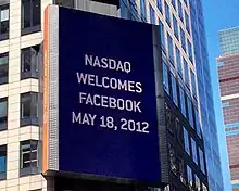 Trading in the stock, which began on May 18, was delayed that day due to technical problems with the Nasdaq exchange.[31] The stock struggled to stay above the IPO price for most of the day, forcing underwriters to buy back shares to support the price.[32] At the closing bell, shares were valued at $38.23,[33] only $0.23 above the IPO price and down $3.82 from the opening bell value. The opening was widely described by the financial press as a disappointment.[34] The stock nonetheless set a new record for trading volume of an IPO.[35] On May 25, 2012, the stock ended its first full week of trading at $31.91, a 16.5% decline.[36]