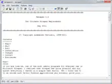 Metapad is an open-source text editor for Microsoft Windows 9x/NT/XP/Vista/7, developed by Alexander Davidson since 1999.[3][4][5][6] The aim of Metapad is to provide a near drop-in replacement of Notepad in Windows. Metapad was distributed as freeware for the first ten years of its existence. On March 20, 2009, the 10th anniversary of its initial release, the Metapad source code was released under GPL-3.0-or-later.[7]