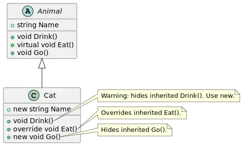 ((Animal)cat).Go(); // calls Animal.Go()!