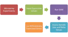 SAM calculates a test statistic for relative difference in gene expression based on permutation analysis of expression data and calculates a false discovery rate. The principal calculations of the program are illustrated below.[32][33][34]