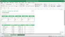 Microsoft Excel has the basic features of all spreadsheets,[7] using a grid of cells arranged in numbered rows and letter-named columns to organize data manipulations like arithmetic operations. It has a battery of supplied functions to answer statistical, engineering, and financial needs. In addition, it can display data as line graphs, histograms and charts, and with a very limited three-dimensional graphical display. It allows sectioning of data to view its dependencies on various factors for different perspectives (using pivot tables and the scenario manager).[8] A PivotTable is a tool for data analysis. It does this by simplifying large data sets via PivotTable fields. It has a programming aspect, Visual Basic for Applications, allowing the user to employ a wide variety of numerical methods, for example, for solving differential equations of mathematical physics,[9][10] and then reporting the results back to the spreadsheet. It also has a variety of interactive features allowing user interfaces that can completely hide the spreadsheet from the user, so the spreadsheet presents itself as a so-called application, or decision support system (DSS), via a custom-designed user interface, for example, a stock analyzer,[11] or in general, as a design tool that asks the user questions and provides answers and reports.[12][13] In a more elaborate realization, an Excel application can automatically poll external databases and measuring instruments using an update schedule,[14] analyze the results, make a Word report or PowerPoint slide show, and e-mail these presentations on a regular basis to a list of participants. Excel was not designed to be used as a database.