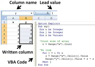 Subroutine in Excel calculates the square of named column variable x read from the spreadsheet, and writes it into the named column variable y.