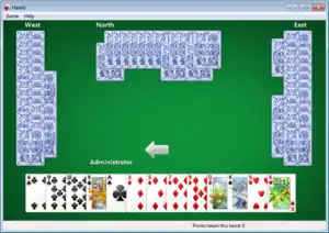 Hearts, also known as Microsoft Hearts,[1] and The Microsoft Hearts Network prior to Windows XP, is a computer game included with Microsoft Windows, based on a card game with the same name. It was first introduced in Windows 3.1 in 1992, and was included in every version of Windows up to Windows 7. Despite the name, the game rules correspond to those of Black Lady in which the queen of spades is a penalty card, in addition to the cards of the heart suit that are the only penalty cards in the traditional card game of Hearts. An online version, named Internet Hearts was included in Me and XP.