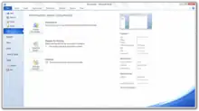 A new Backstage view interface replaces the Office menu introduced in Office 2007 and is designed to facilitate access to document management and sharing tasks by consolidating them within a single location.[76] In theatre, backstage refers to the area behind the stage where behind the scenes activities and preparations commence; the Backstage view is accordingly an interface dedicated to activities and preparations before saving or sharing a document.[77] Backstage consists of both a left-hand navigation pane and an adjacent main pane; the navigation pane includes a series of vertically arranged common commands to open or save files, and tabs that, when opened, expose document management tasks and contextual information within the main pane.[76][78] A customizable number of recently opened documents can also be displayed within the navigation pane.[79]