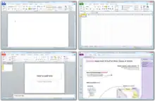![]() Microsoft Office 2010 in Windows Vista—clockwise from top left: Word, Excel, OneNote, and PowerPoint; these programs constitute the Home and Student edition. | |