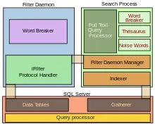 The Full Text Search engine is divided into two processes: the Filter Daemon process (msftefd.exe) and the Search process (msftesql.exe). These processes interact with the SQL Server. The Search process includes the indexer (that creates the full text indexes) and the full text query processor. The indexer scans through text columns in the database. It can also index through binary columns, and use iFilters to extract meaningful text from the binary blob (for example, when a Microsoft Word document is stored as an unstructured binary file in a database). The iFilters are hosted by the Filter Daemon process. Once the text is extracted, the Filter Daemon process breaks it up into a sequence of words and hands it over to the indexer. The indexer filters out noise words, i.e., words like A, And, etc., which occur frequently and are not useful for search. With the remaining words, an inverted index is created, associating each word with the columns they were found in. SQL Server itself includes a Gatherer component that monitors changes to tables and invokes the indexer in case of updates.[61]