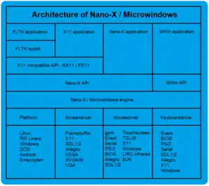 In computing, Nano-X is a windowing system which is full featured enough to be used on a PC, an embedded system[1][2] or a PDA.[3][4] It is an Open Source project aimed at bringing the features of modern graphical windowing environments to smaller devices and platforms. The project was renamed from Microwindows due to legal threats from Microsoft regarding the Windows trademark.