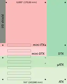Mini-ITX is a 170 mm × 170 mm (6.7 in × 6.7 in) motherboard form factor developed by VIA Technologies in 2001.[1] Mini-ITX motherboards have been traditionally used in small-configured computer systems. Originally, Mini-ITX was a niche standard designed for fanless cooling with a low power consumption architecture, which made them useful for home theater PC systems, where fan noise can detract from the cinema experience.