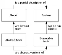 A model describing a SUT is usually an abstract, partial presentation of the SUT's desired behavior. Test cases derived from such a model are functional tests on the same level of abstraction as the model. These test cases are collectively known as an abstract test suite. An abstract test suite cannot be directly executed against an SUT because the suite is on the wrong level of abstraction. An executable test suite needs to be derived from a corresponding abstract test suite. The executable test suite can communicate directly with the system under test. This is achieved by mapping the abstract test cases to concrete test cases suitable for execution. In some model-based testing environments, models contain enough information to generate executable test suites directly. In others, elements in the abstract test suite must be mapped to specific statements or method calls in the software to create a concrete test suite. This is called solving the "mapping problem".[1] In the case of online testing (see below), abstract test suites exist only conceptually but not as explicit artifacts.