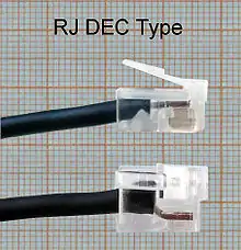 The Modified Modular Jack (MMJ) is a small form-factor serial port connector developed by Digital Equipment Corporation (DEC). It uses a modified version of the 6P6C modular connector with the latch displaced off-center so standard modular connectors found on Ethernet cables or phone jacks cannot accidentally be plugged in. MMJ connections are used on Digital minicomputers, such as the PDP-11, VAX and Alpha systems, and to connect terminals, printers, and serial console servers.[1]